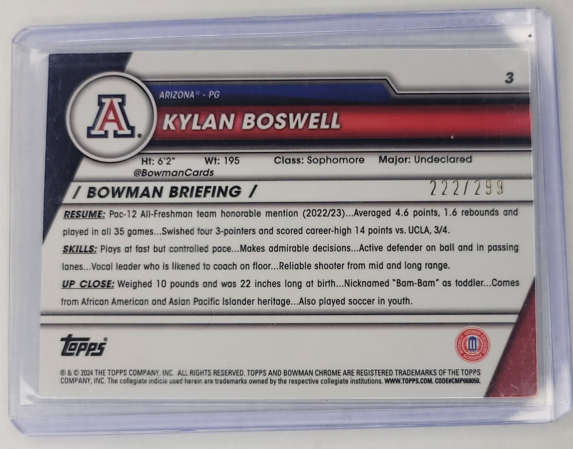 This Kylan Boswell 2023-2024 1st Bowman U Aqua Wave no.3 #'d 222/299 is in excellent condition and comes in a soft sleeve and hard plastic card protector. This would make an excellent addition to any Kylan Boswell or Arizona University fan collection. This card is from the 2023-2024 Bowman U Chrome Basketball card set.